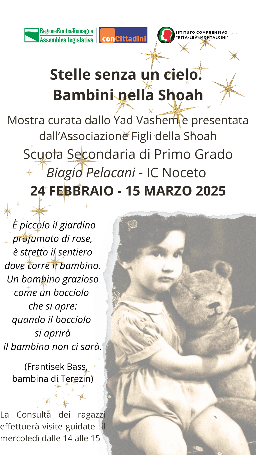 La mostra “Stelle senza un cielo. Bambini nella Shoah” mette al centro le storie di bambini ebrei che sono stati strappati troppo presto all’infanzia. Curata dallo Yad Vashem è stata messa a disposizione dall’Associazione Figli della Shoah tramite l’Assemblea Legislativa della Regione Emilia-Romagna.