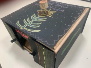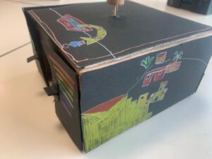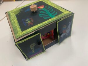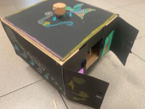 Il racconto di ‘Gilgamesh’ tratto dal testo di Annamaria Gozzi è stato dapprima narrato in Aula Magna da un attore del teatro dell’Orsa e poi ripreso in ogni classe, illustrato e inserito su una sorta di trottola girevole posta all’interno del teatrino.