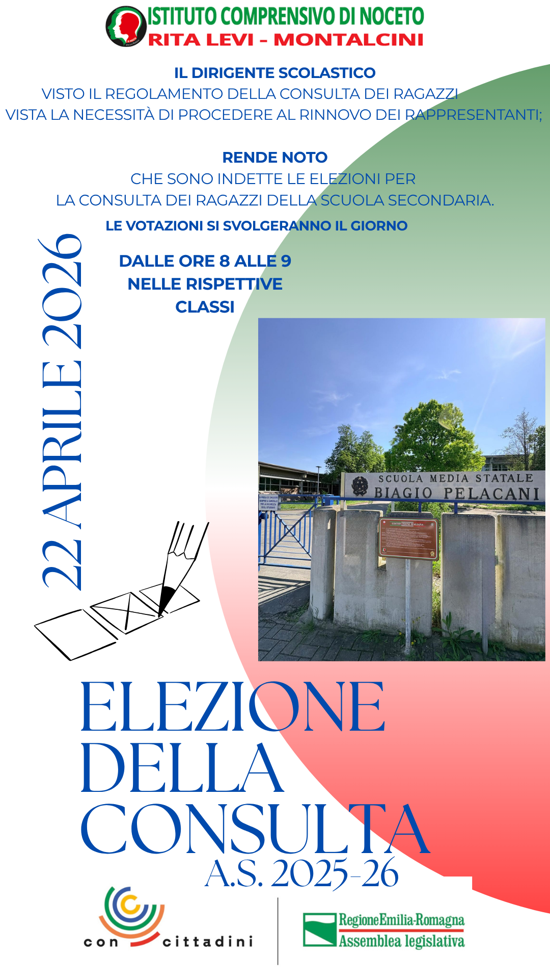 Mercoledì 22 aprile presso la Scuola Secondaria si terranno le elezioni della Consulta dei Ragazzi per il prossimo anno scolastico.